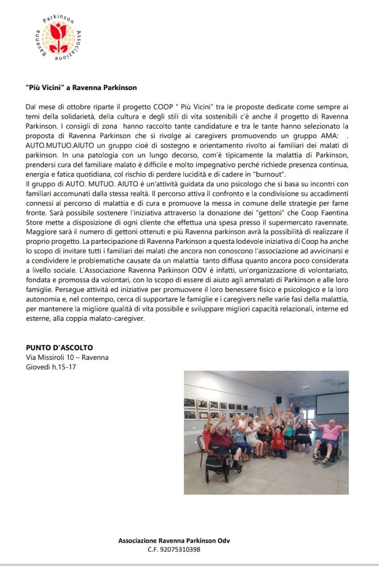 L’Associazione Ravenna Parkinson è un’organizzazione fondata e promossa da volontari con lo scopo di essere d'aiuto a tutti gli ammalati e ai loro familiari e perseguire attività ed iniziative per promuovere il loro benessere.